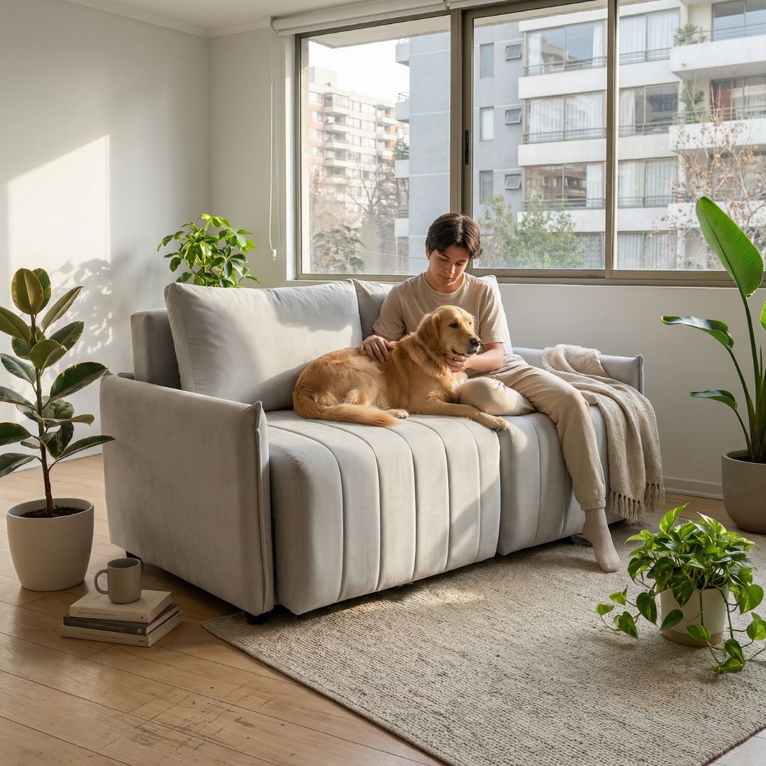 Aspire regularmente con baja succión para mantenerlo libre de polvo, limpie derrames de inmediato con un paño absorbente, deje que su sofá se seque naturalmente en un área bien ventilada.