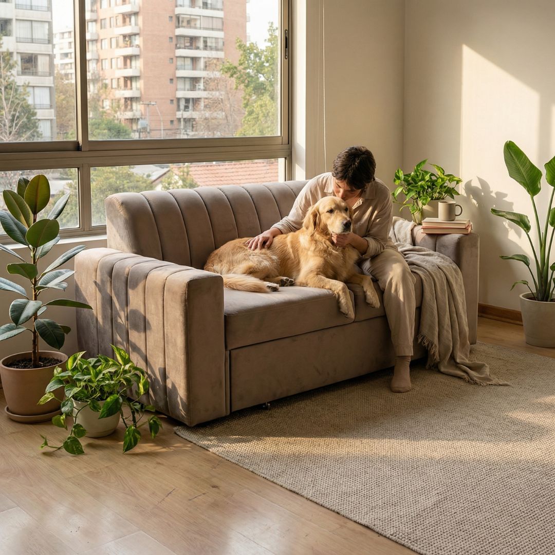 El sofá cama Nantes es la combinación perfecta entre comodidad y diseño. Su respaldo tubular le da un toque moderno y elegante a tu living. La tela suave y generosa con la piel te brinda un confort incomparable.
