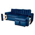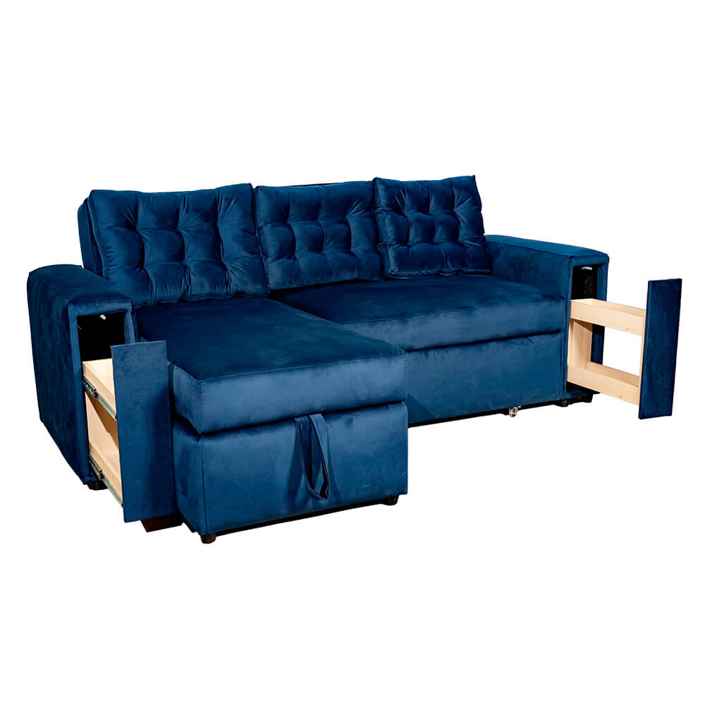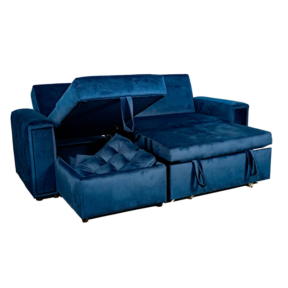 El sofá cama Palermo combina la suavidad de cómodos cojines con gabinetes secretos integrados en los brazos, junto con un amplio baúl que añade versatilidad adicional para almacenar tus objetos personales de manera organizada y fuera de la vista.